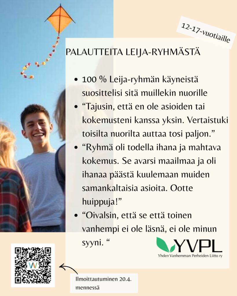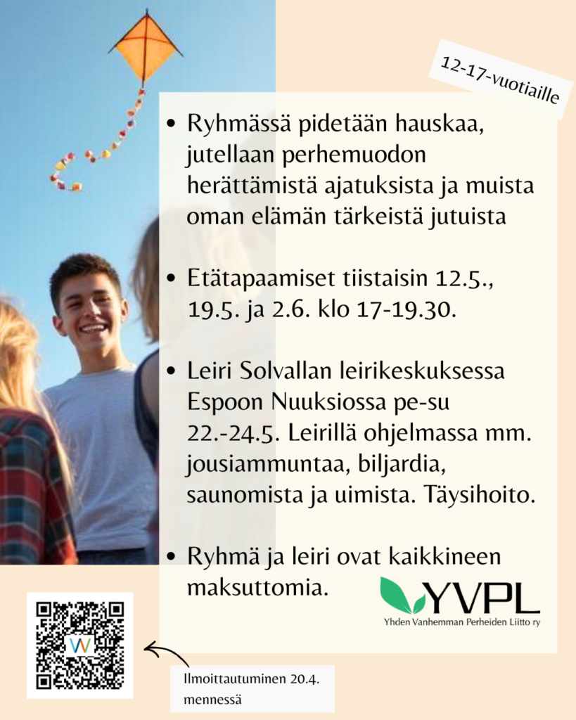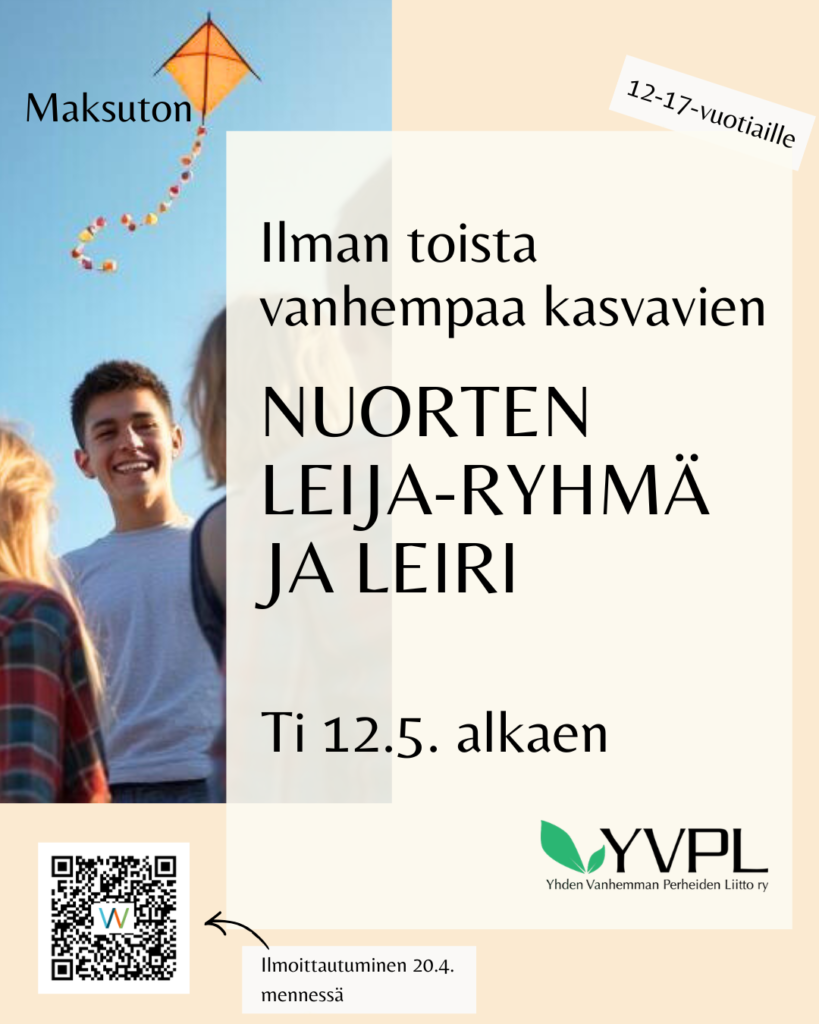 Tämä vertaisryhmä on tarkoitettu ilman toista vanhempaa kasvaville 12-17-vuotiaille nuorille*. Nuori voi kasvaa ilman toista vanhempaa esimerkiksi vanhempien eron vuoksi, tai koska vanhemmat eivät ole missään vaiheessa olleet parisuhteessa. Toinen vanhempi on myös aiemmin saattanut olla mukana elämässä, mutta yhteys on katkennut.