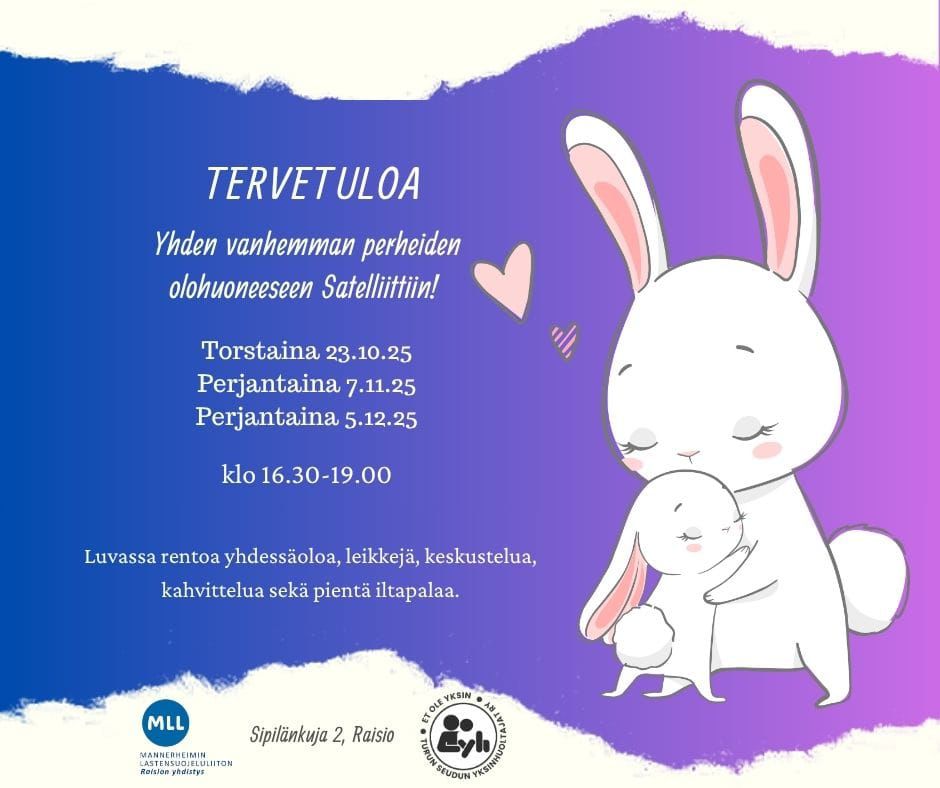 Luvassa rentoa yhdessäoloa, leikkejä, keskustelua, kahvittelua sekä pientä naposteltavaa. Olohuoneet järjestetään yhteistyössä MLL:n kanssa